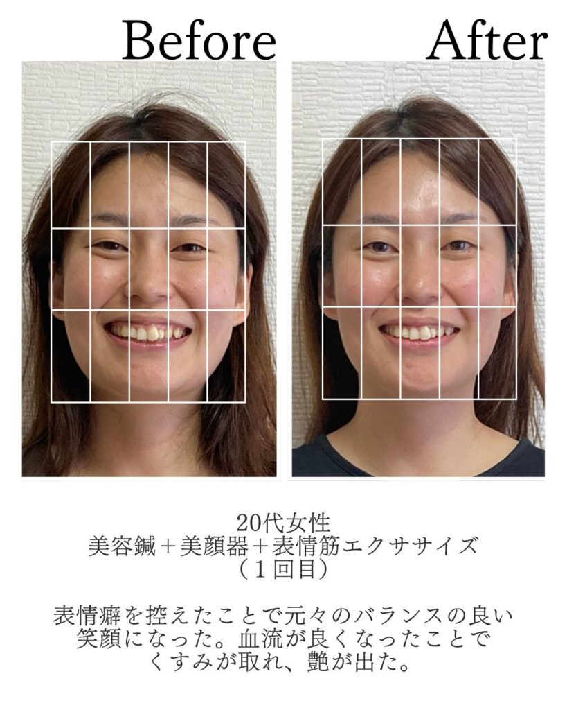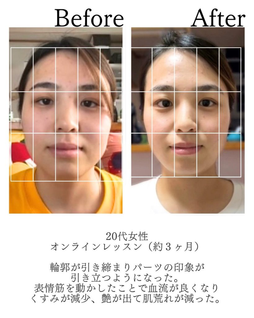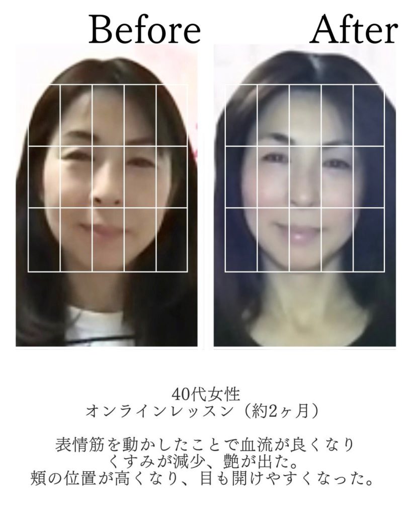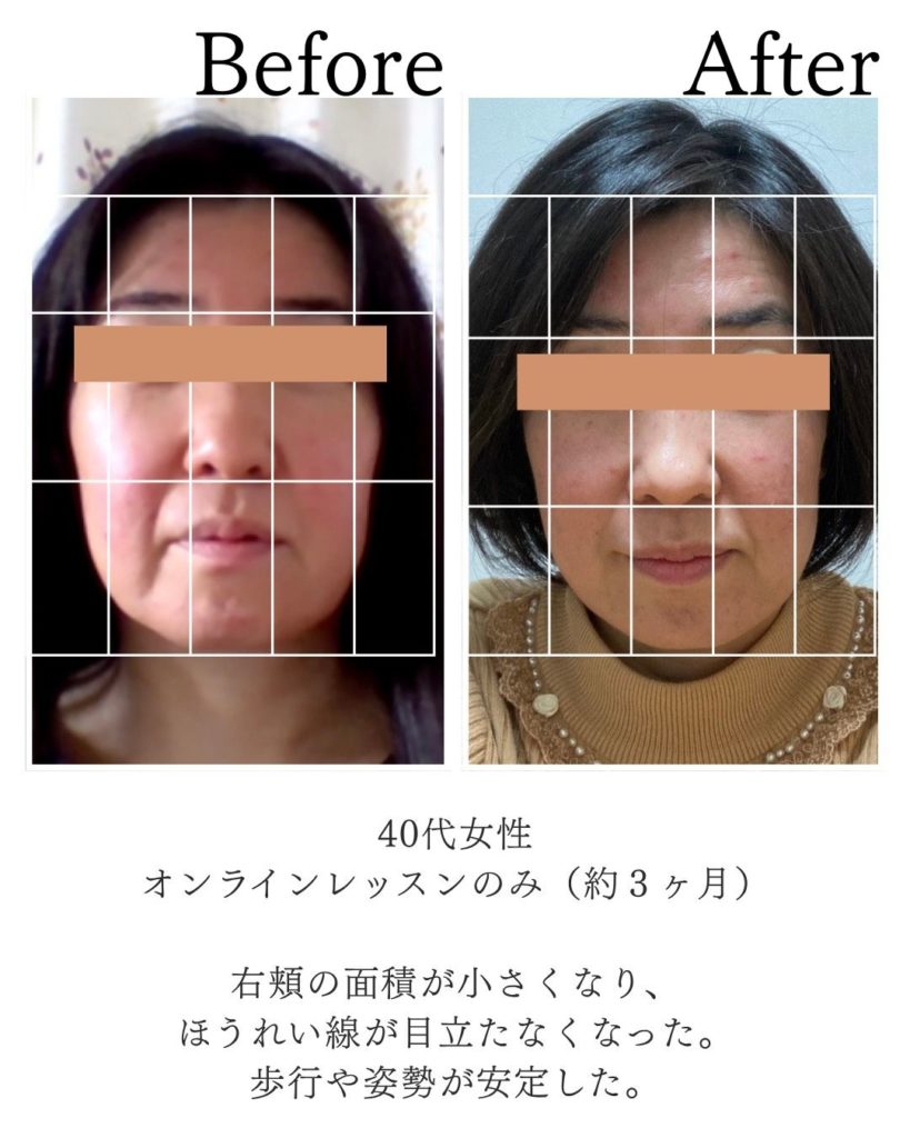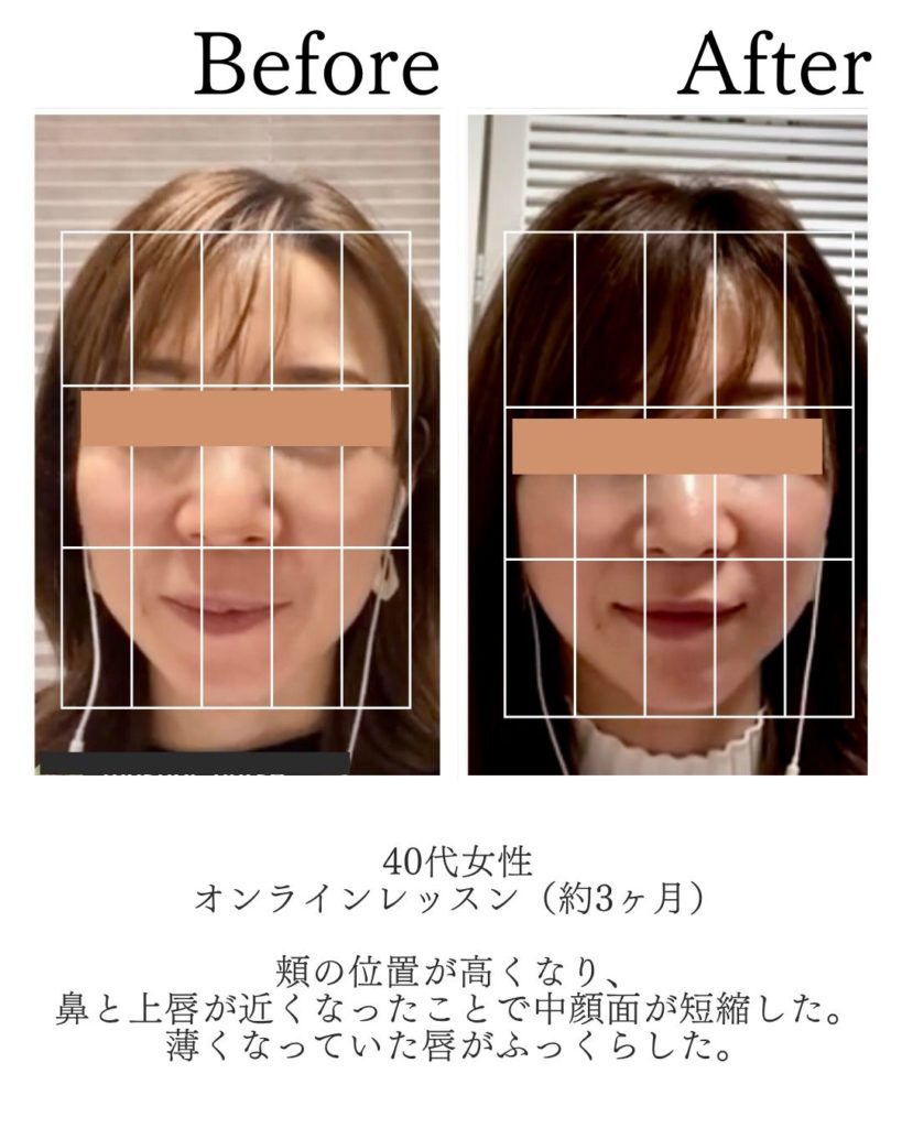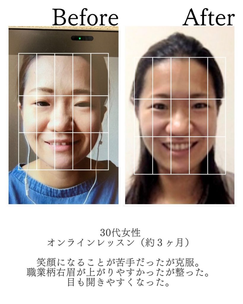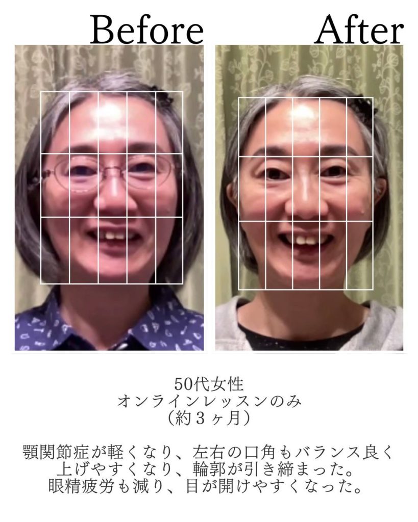 愛子先生の表情筋のレッスンを受けて、 客観的に自分の癖を教えていただき、 さらに顔トレで癖を変えて長年の眉間のシワが薄くなったのが、私にとって一番の良い意味での驚きでした。